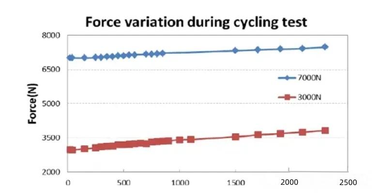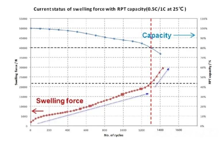 Based on experience, the initial assembly force is generally recommended to be between 100 kgf and 700 kgf. Some research has found that when the cell capacity is low, the expansion force is relatively mild. However, as shown in the chart below for a specific Lithium Iron Phosphate (LFP) battery, the cell expansion force increases sharply after the State of Charge (SOC) exceeds 80%. Interestingly, LFP is less sensitive to assembly force, a topic that gained more attention mainly after the rise of high-energy-density NMC (Nickel Manganese Cobalt) batteries for vehicles. The author couldn't find highly authoritative research literature on this, as it really depends on the cell form factor and the specific processes of different power battery manufacturers.